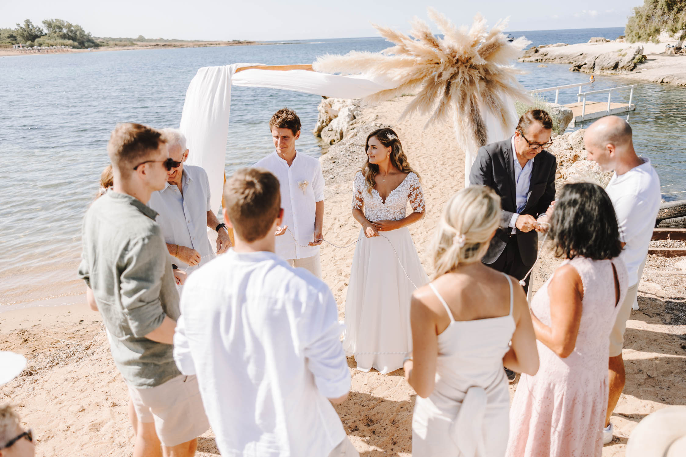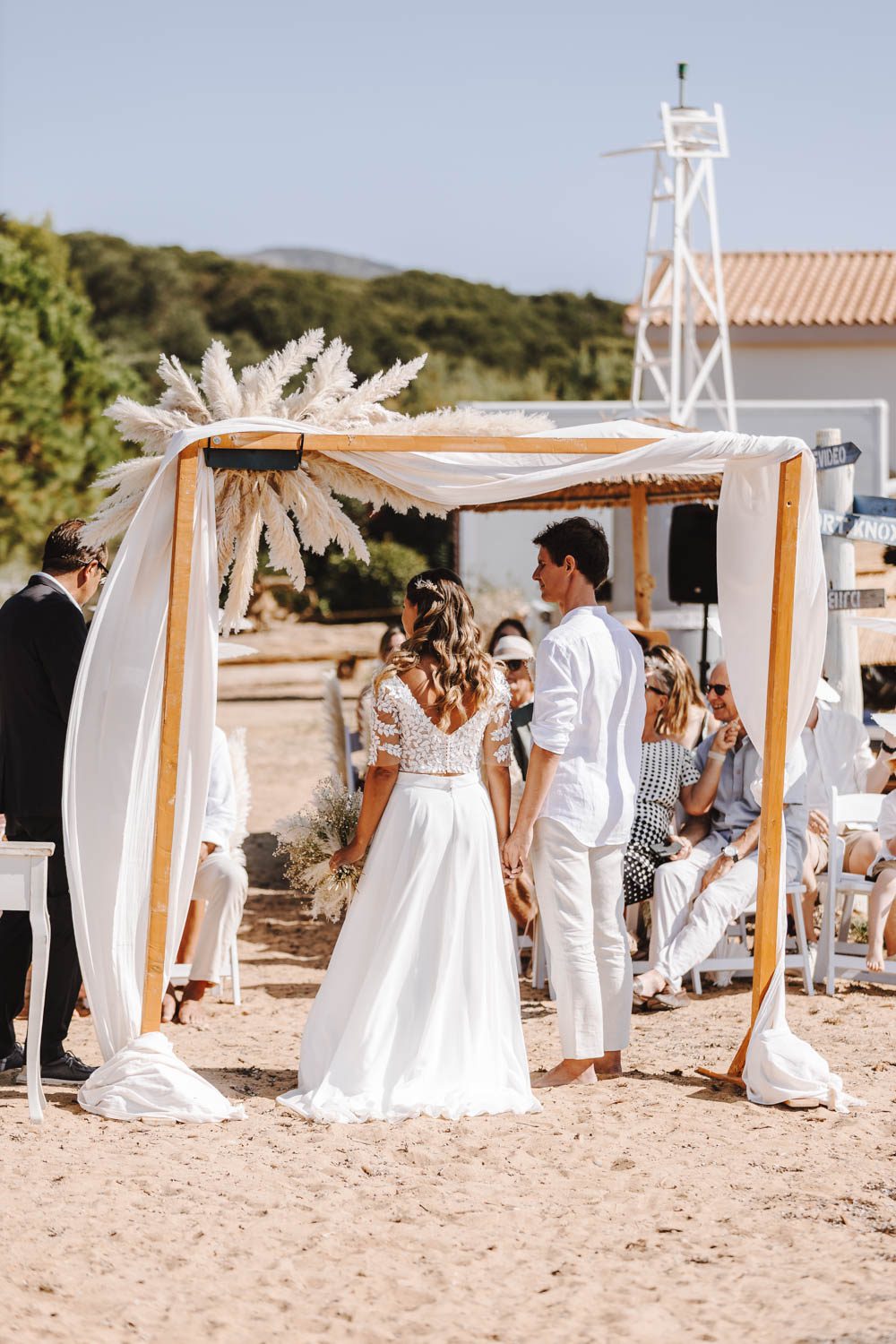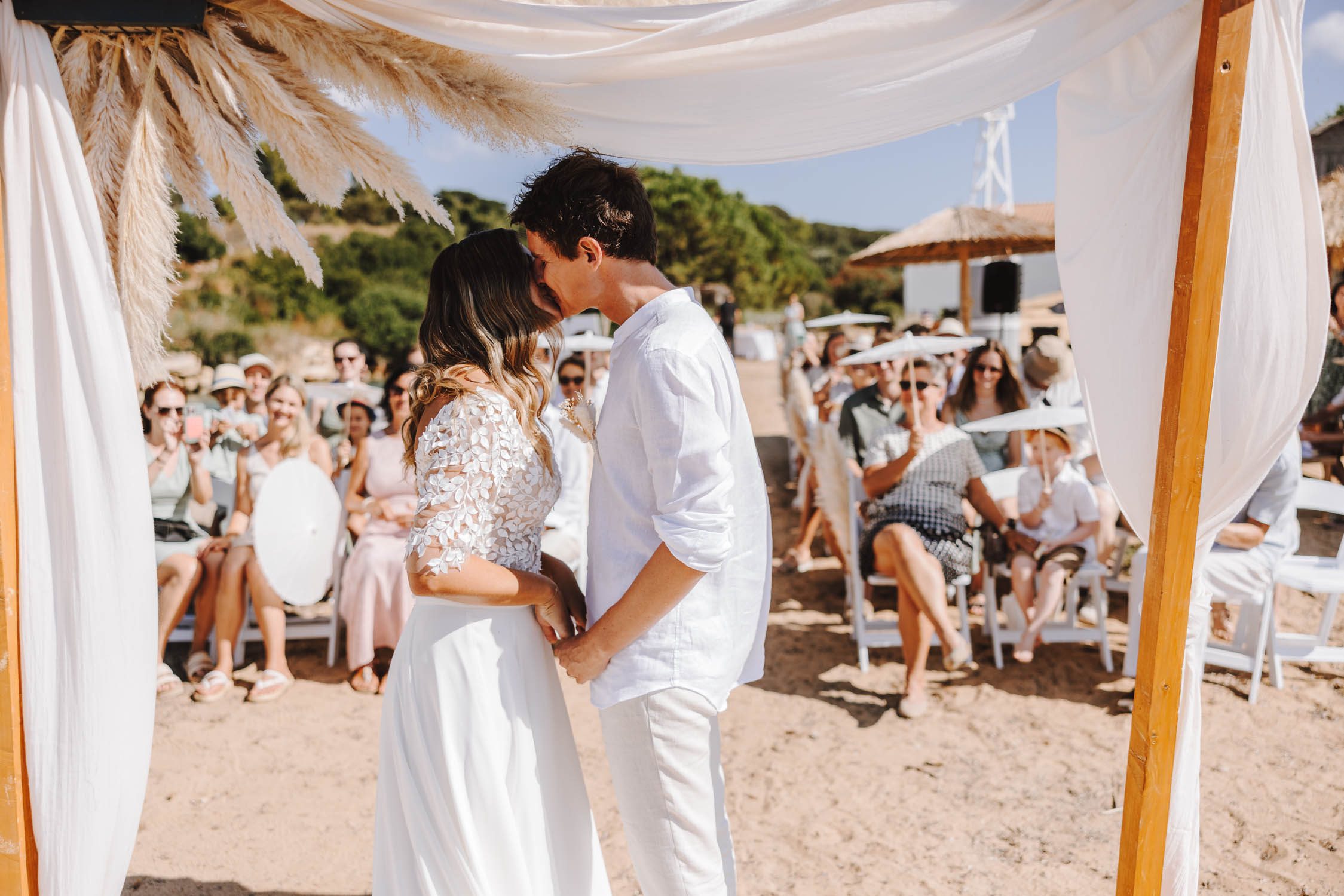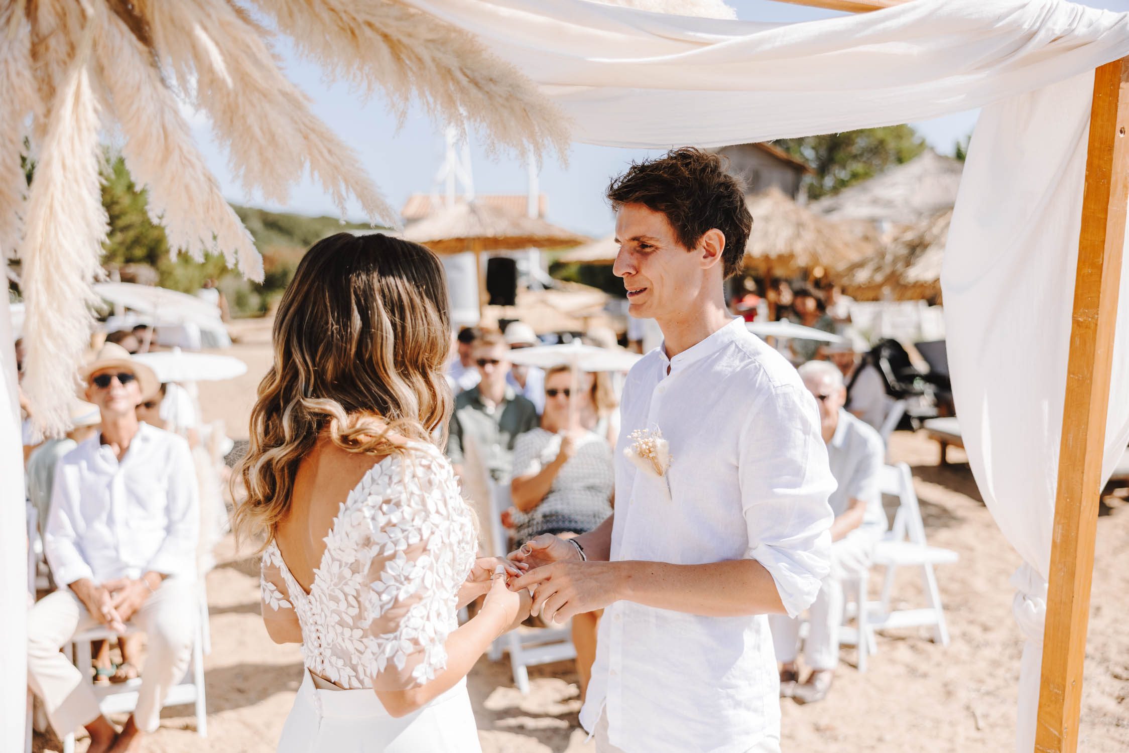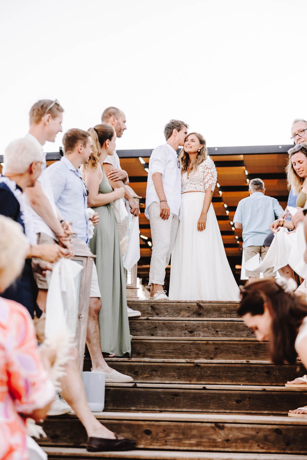 Nach dem innigen First Look habe ich am Sandstrand mit den beiden ein kleines Paarshooting gemacht, bevor es ohne große Pause zur Trauung ging. So früh am Tag war der Strand noch fast leer, und die Zeremonie blieb ganz ungestört – zwei Gäste sorgten mit Gesang und Gitarre für die ultimative Atmosphäre und man konnte die Liebe zum Detail förmlich spüren.