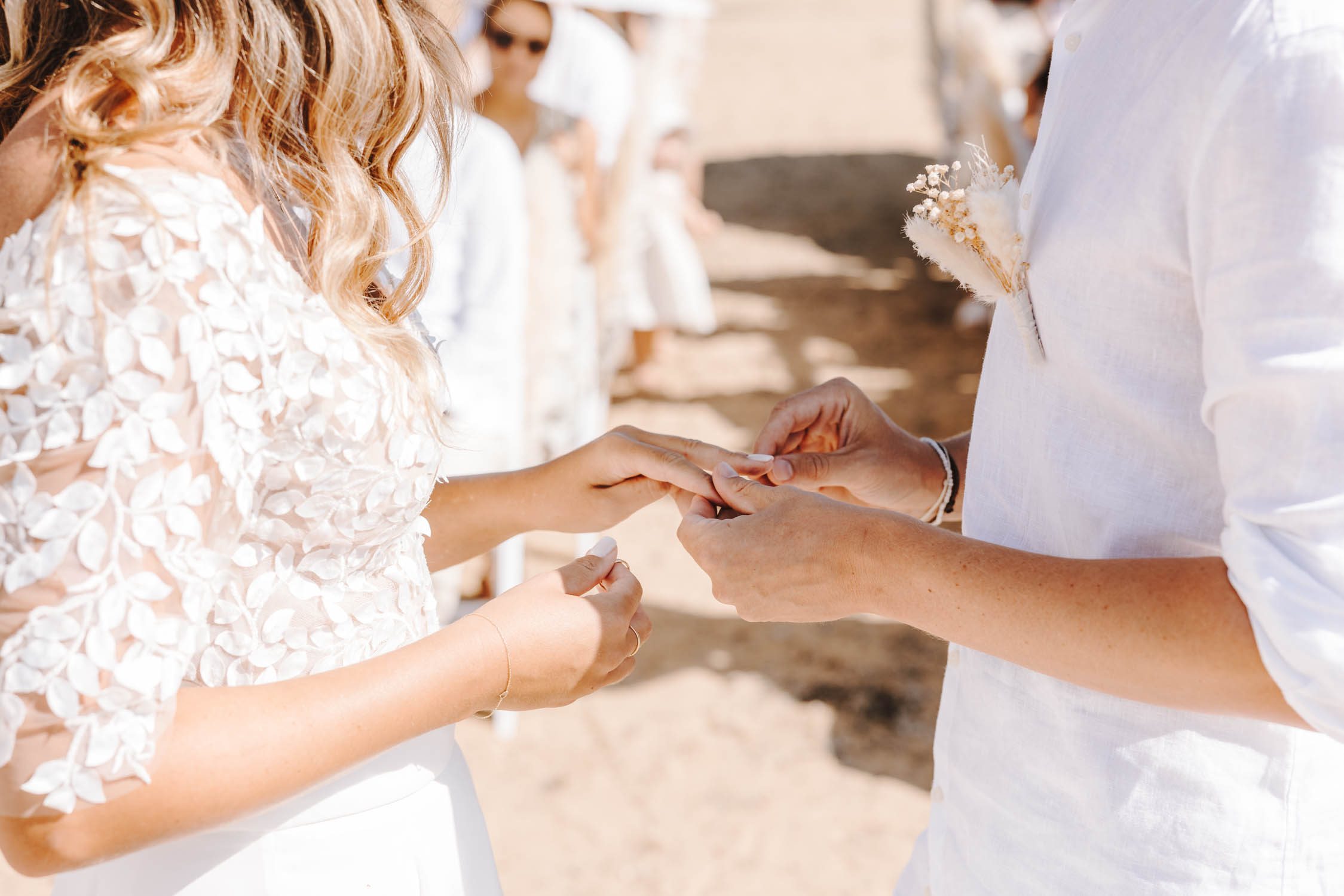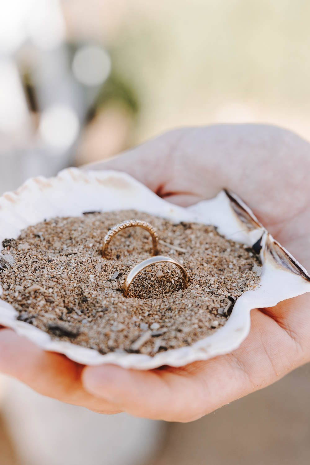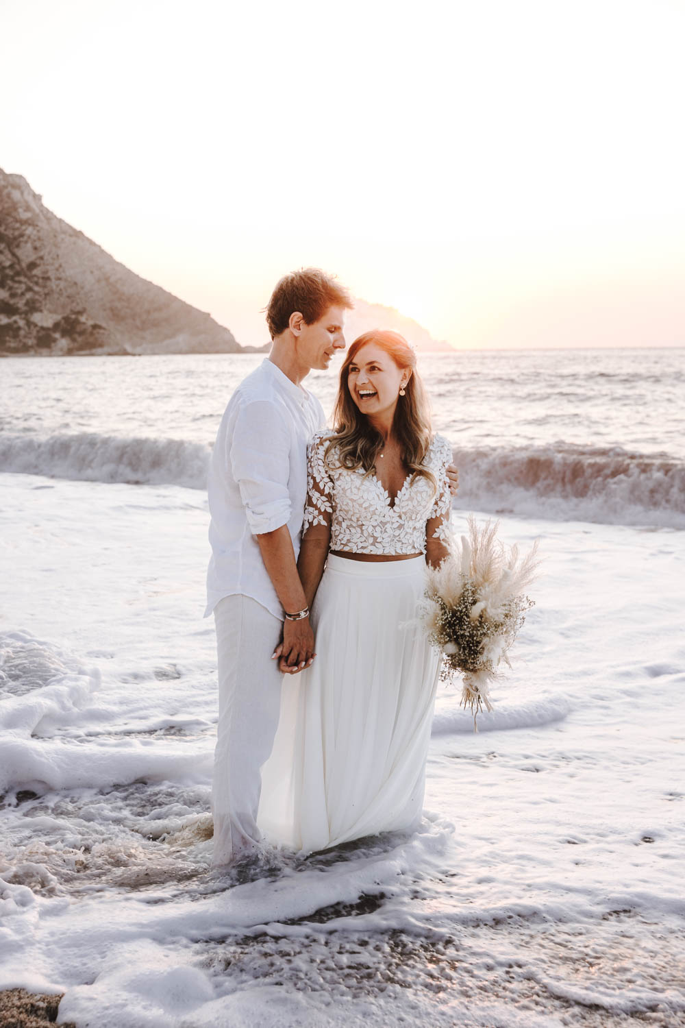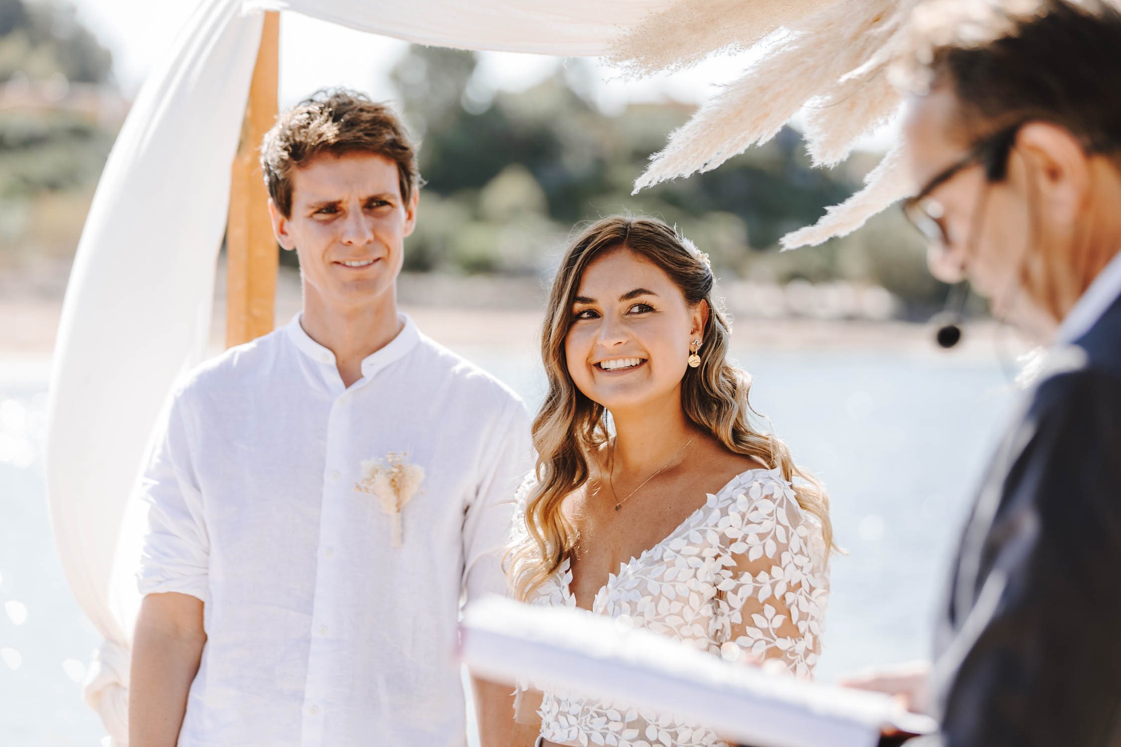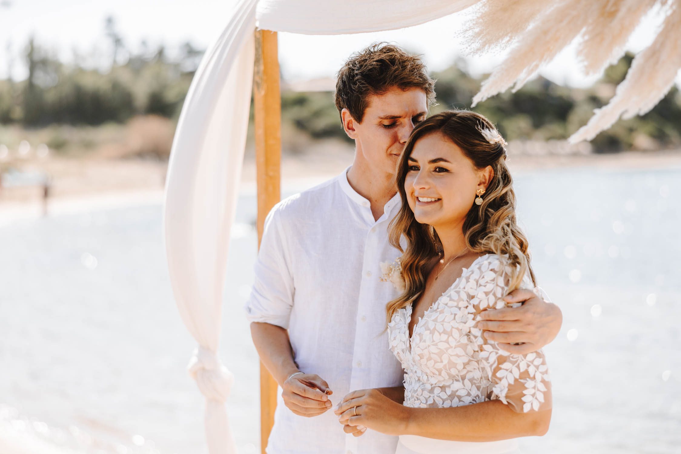 Nach dem innigen First Look habe ich am Sandstrand mit den beiden ein kleines Paarshooting gemacht, bevor es ohne große Pause zur Trauung ging. So früh am Tag war der Strand noch fast leer, und die Zeremonie blieb ganz ungestört – zwei Gäste sorgten mit Gesang und Gitarre für die ultimative Atmosphäre und man konnte die Liebe zum Detail förmlich spüren.