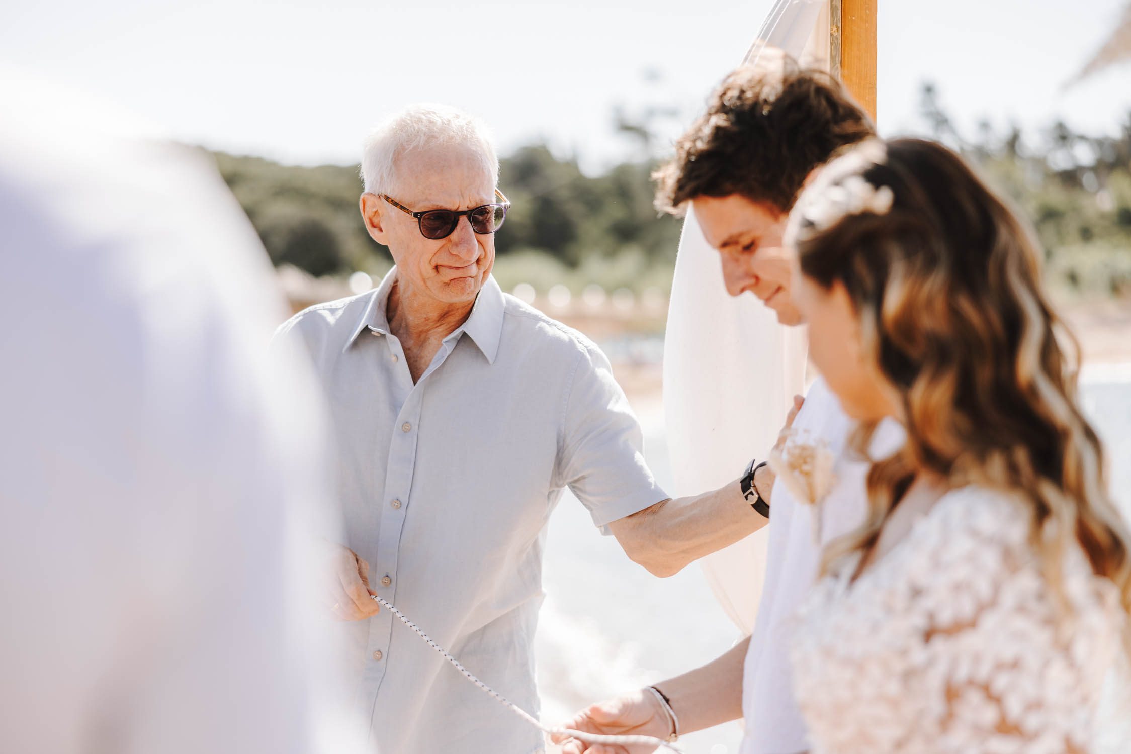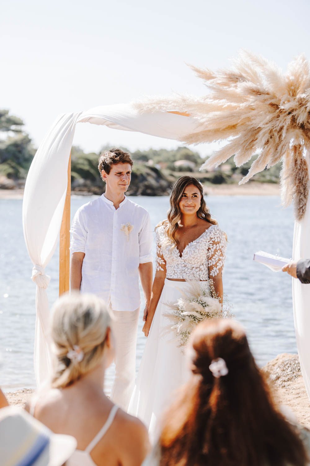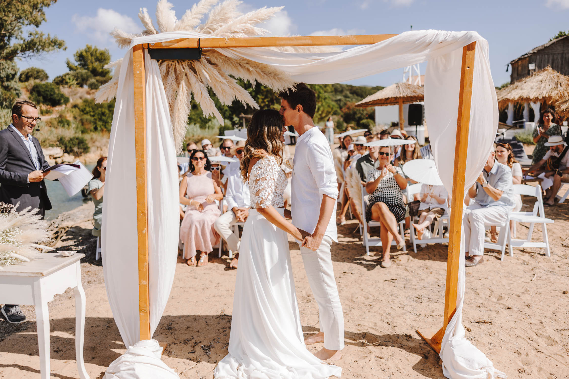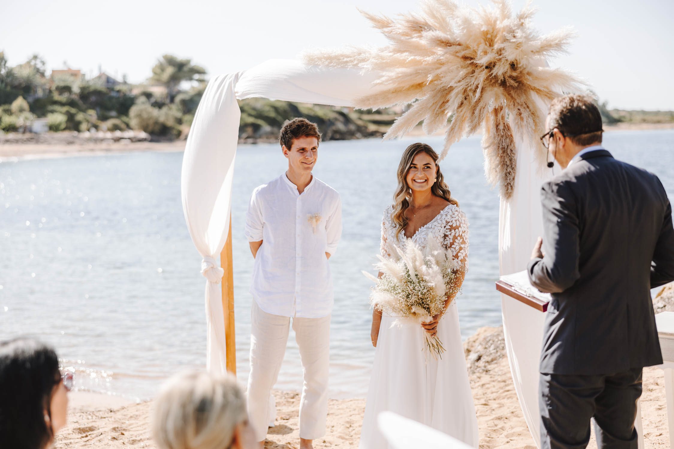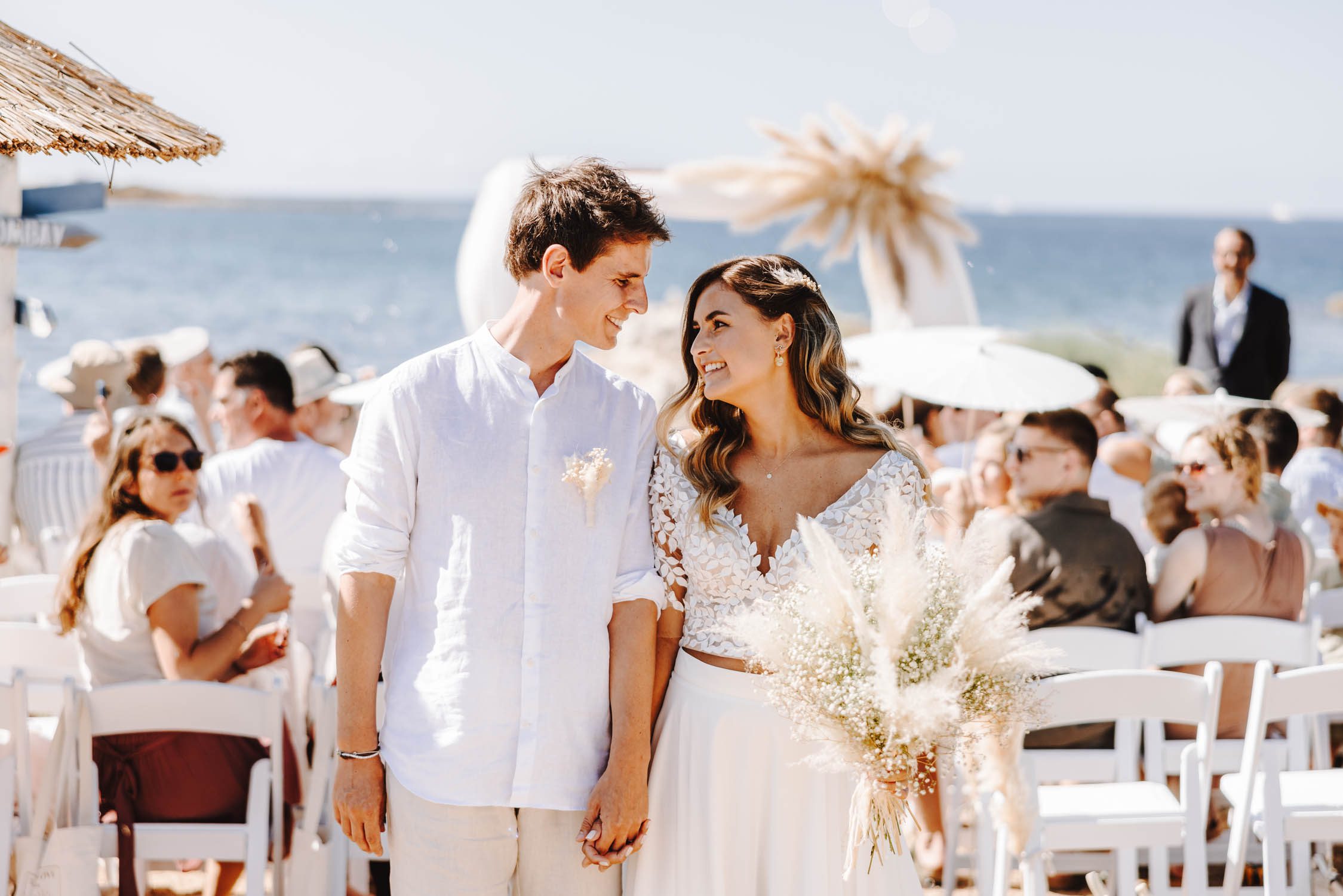 Nach dem innigen First Look habe ich am Sandstrand mit den beiden ein kleines Paarshooting gemacht, bevor es ohne große Pause zur Trauung ging. So früh am Tag war der Strand noch fast leer, und die Zeremonie blieb ganz ungestört – zwei Gäste sorgten mit Gesang und Gitarre für die ultimative Atmosphäre und man konnte die Liebe zum Detail förmlich spüren.