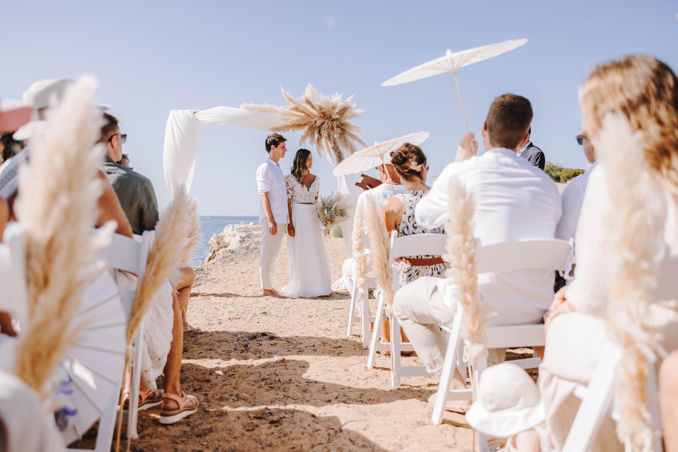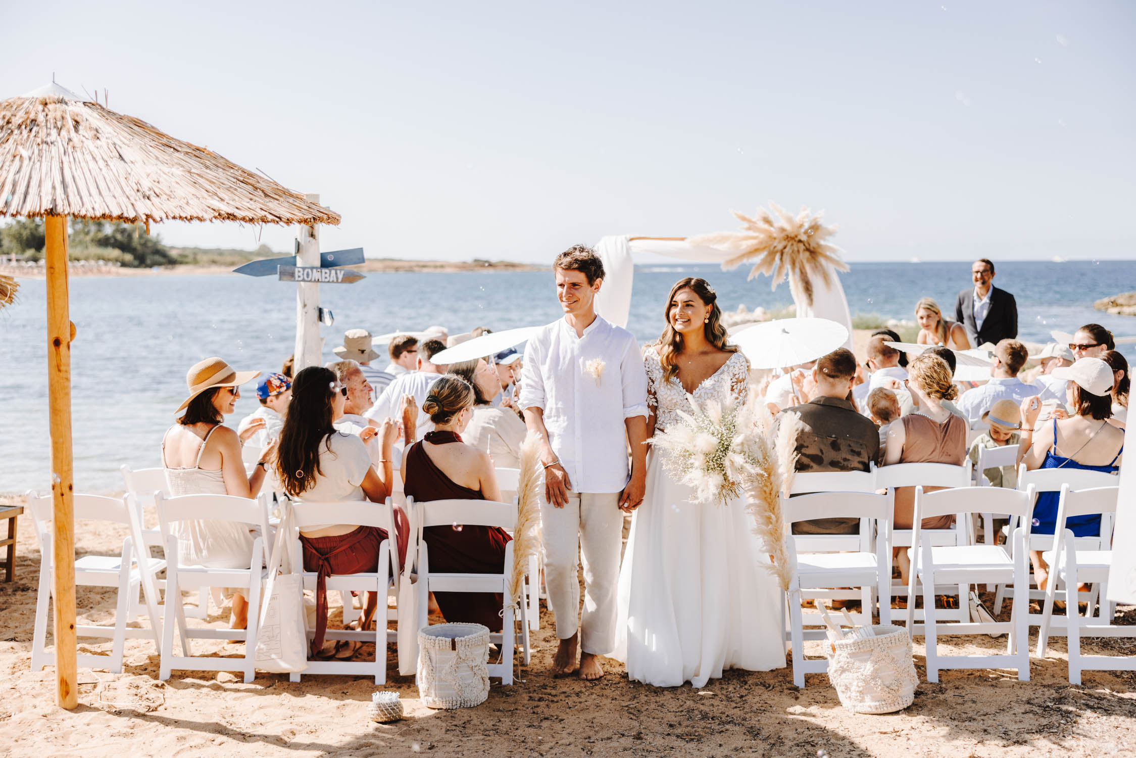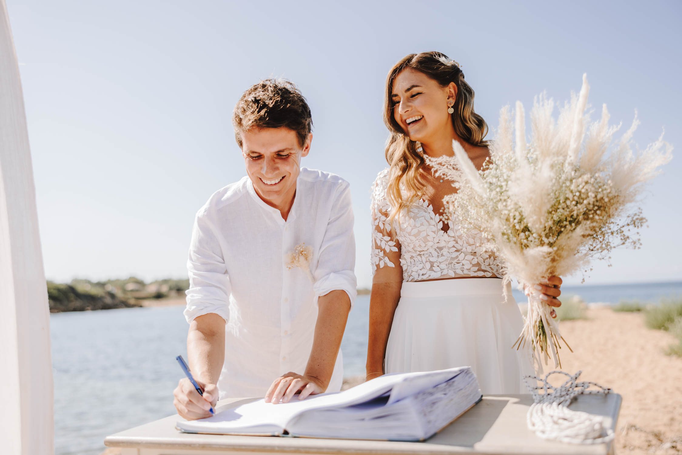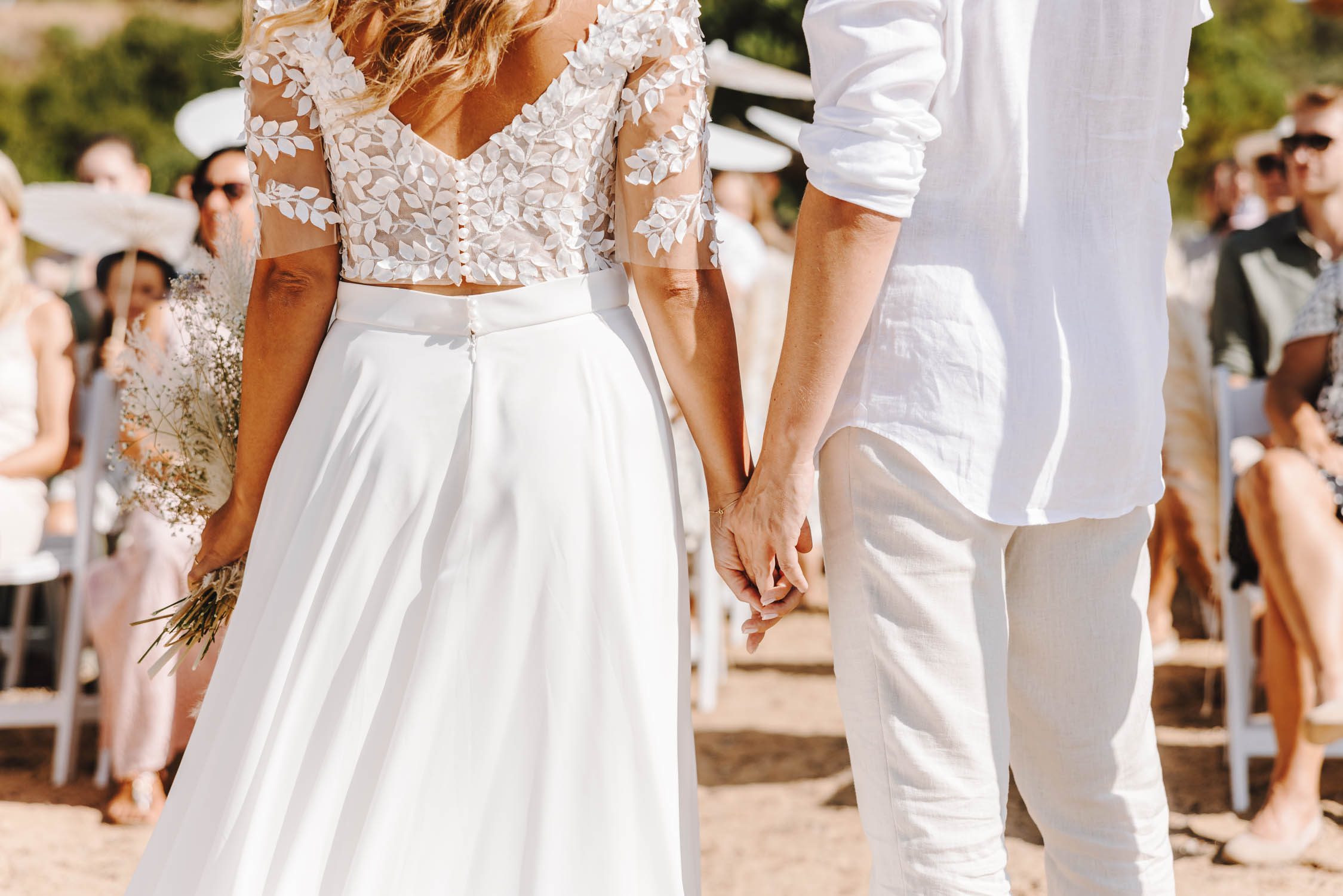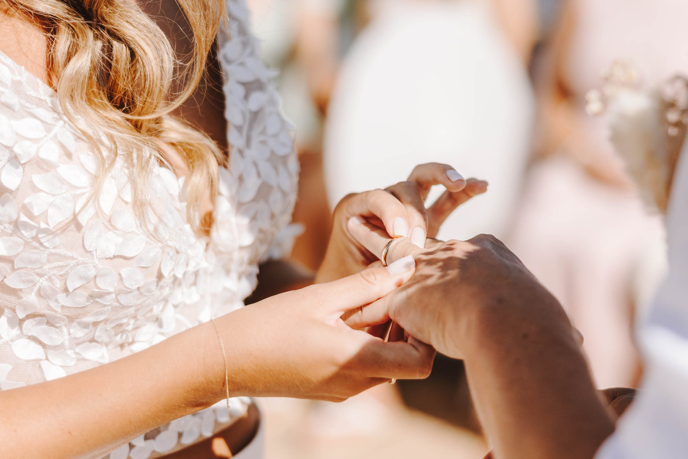Nach dem innigen First Look habe ich am Sandstrand mit den beiden ein kleines Paarshooting gemacht, bevor es ohne große Pause zur Trauung ging. So früh am Tag war der Strand noch fast leer, und die Zeremonie blieb ganz ungestört – zwei Gäste sorgten mit Gesang und Gitarre für die ultimative Atmosphäre und man konnte die Liebe zum Detail förmlich spüren.
