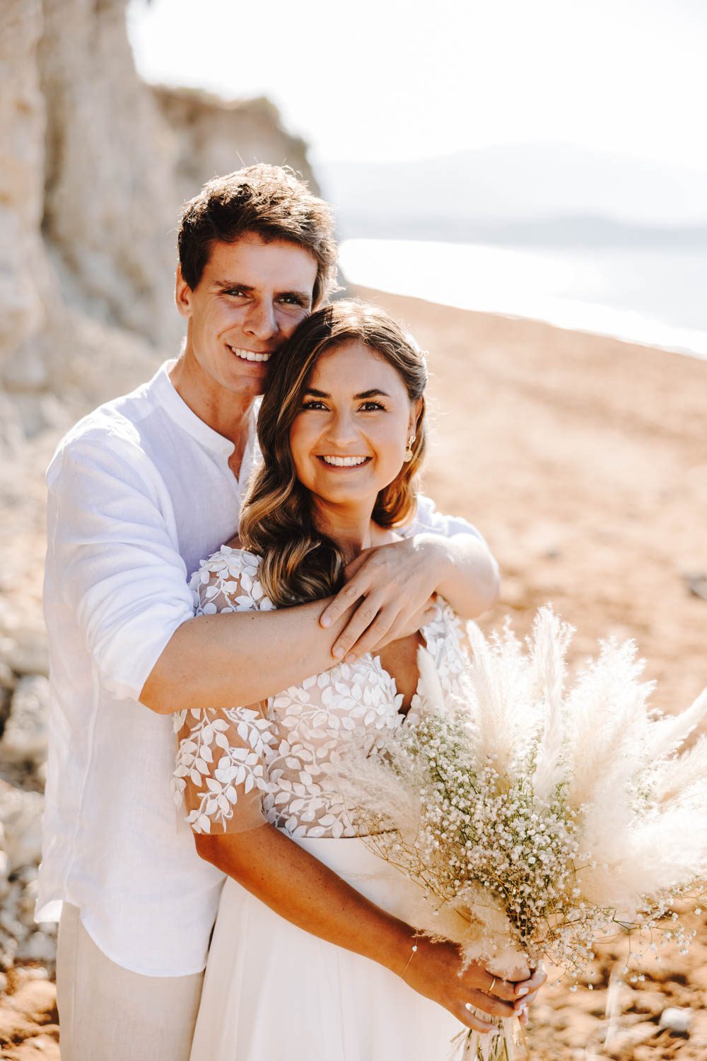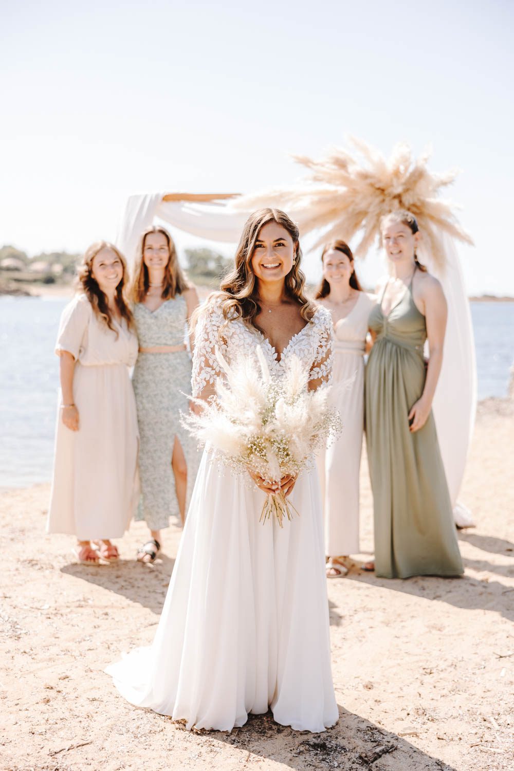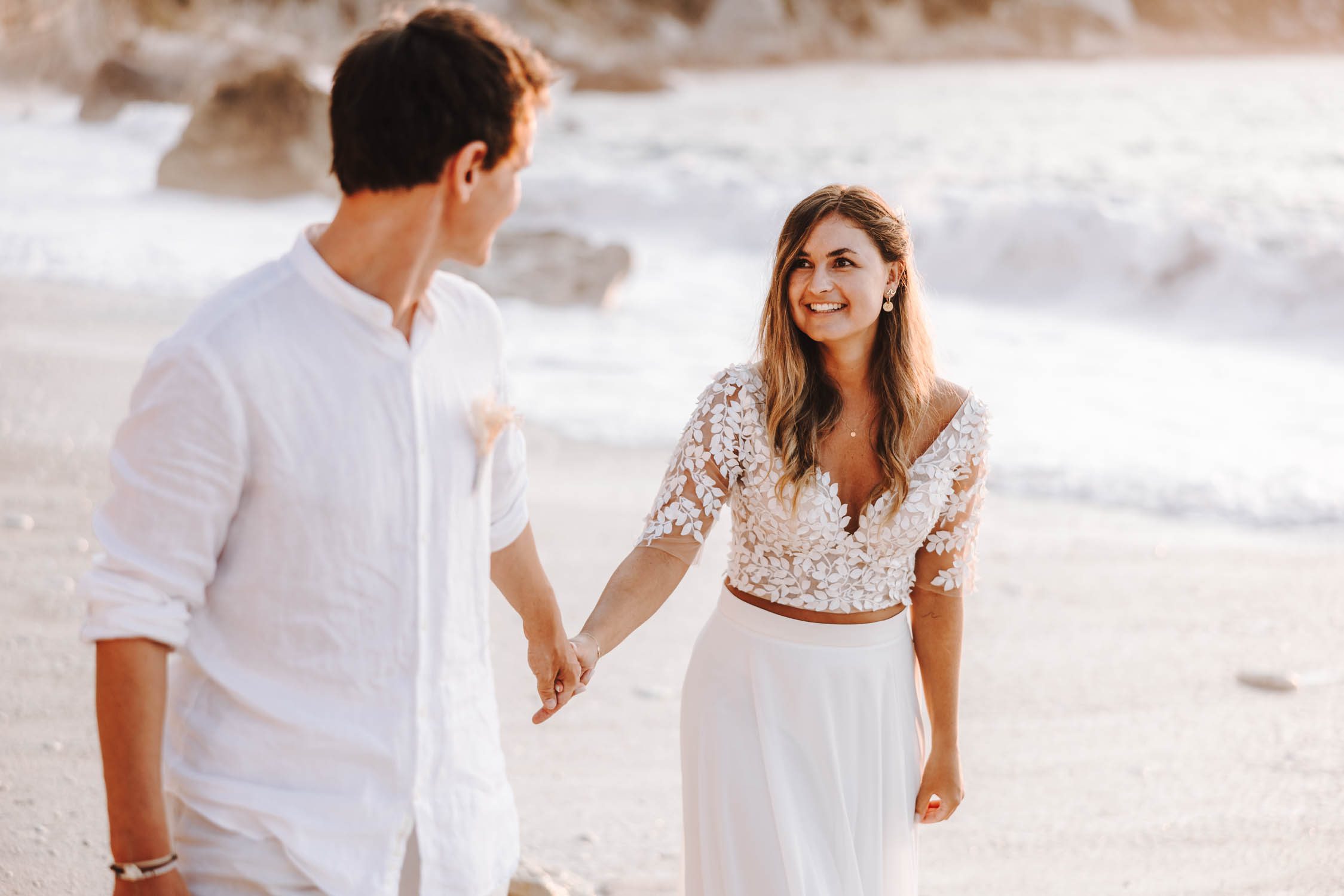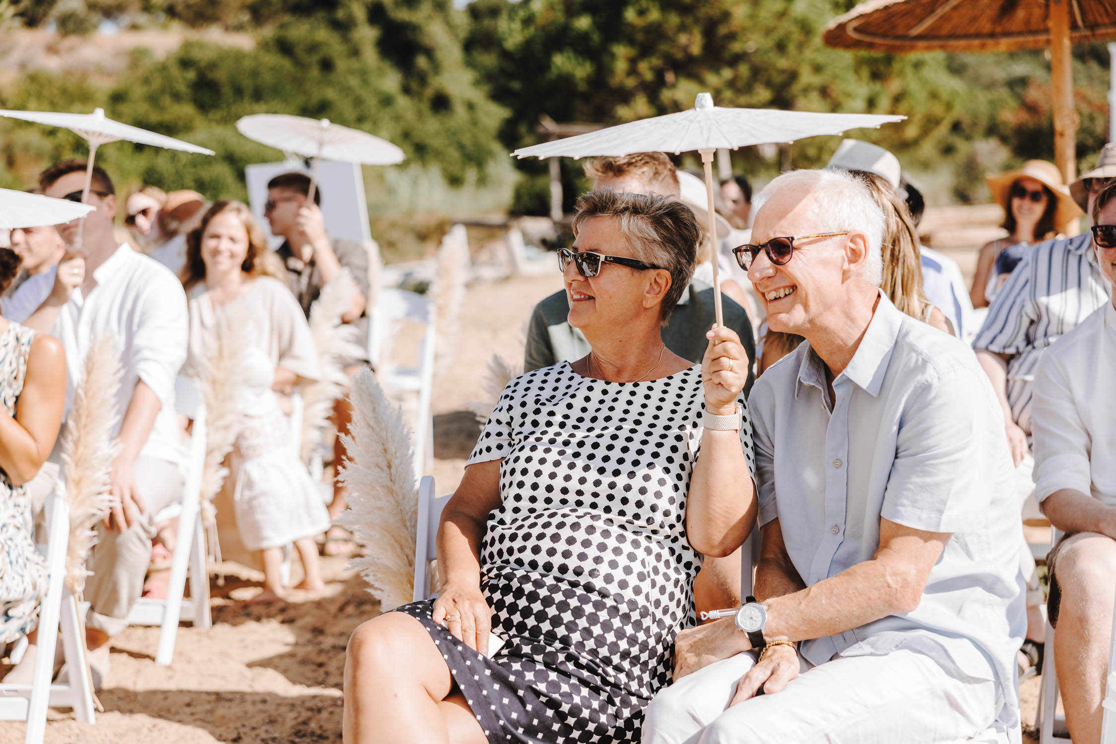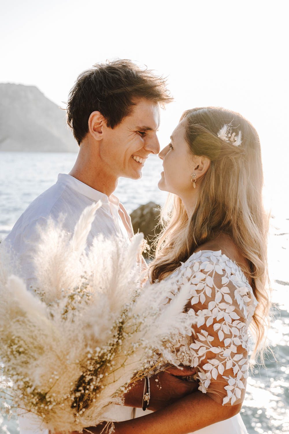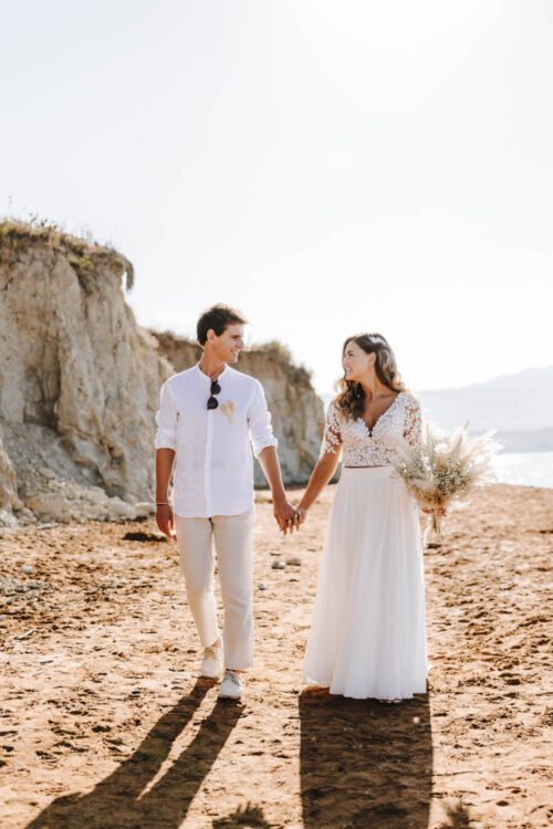 Nach dem innigen First Look habe ich am Sandstrand mit den beiden ein kleines Paarshooting gemacht, bevor es ohne große Pause zur Trauung ging. So früh am Tag war der Strand noch fast leer, und die Zeremonie blieb ganz ungestört – zwei Gäste sorgten mit Gesang und Gitarre für die ultimative Atmosphäre und man konnte die Liebe zum Detail förmlich spüren.
