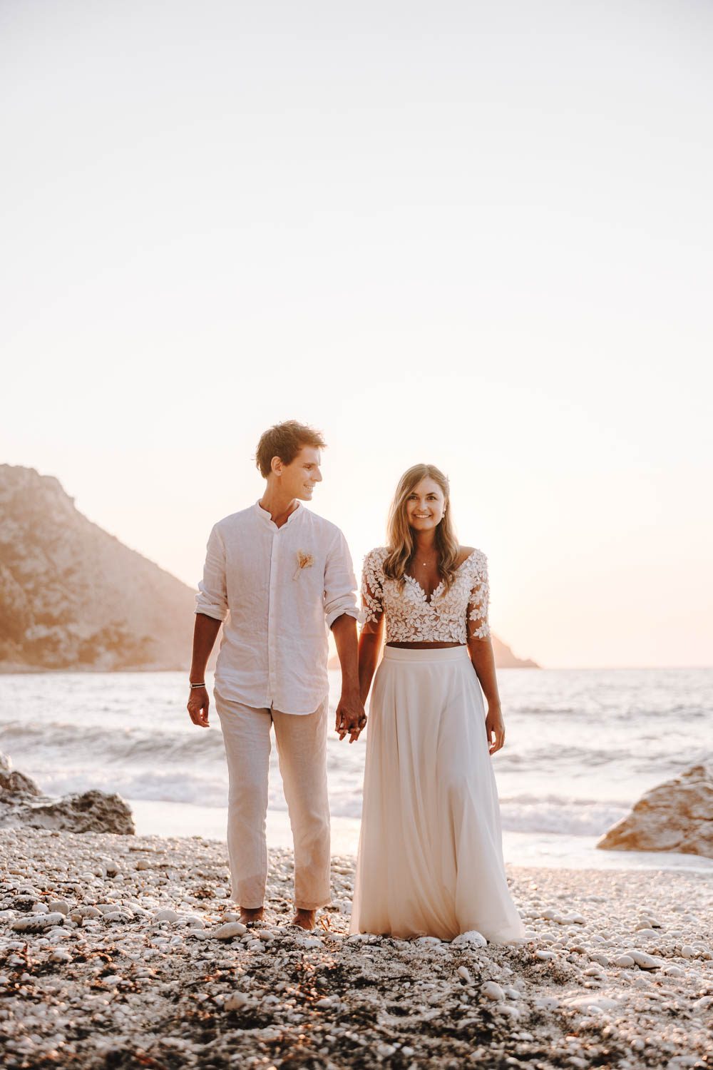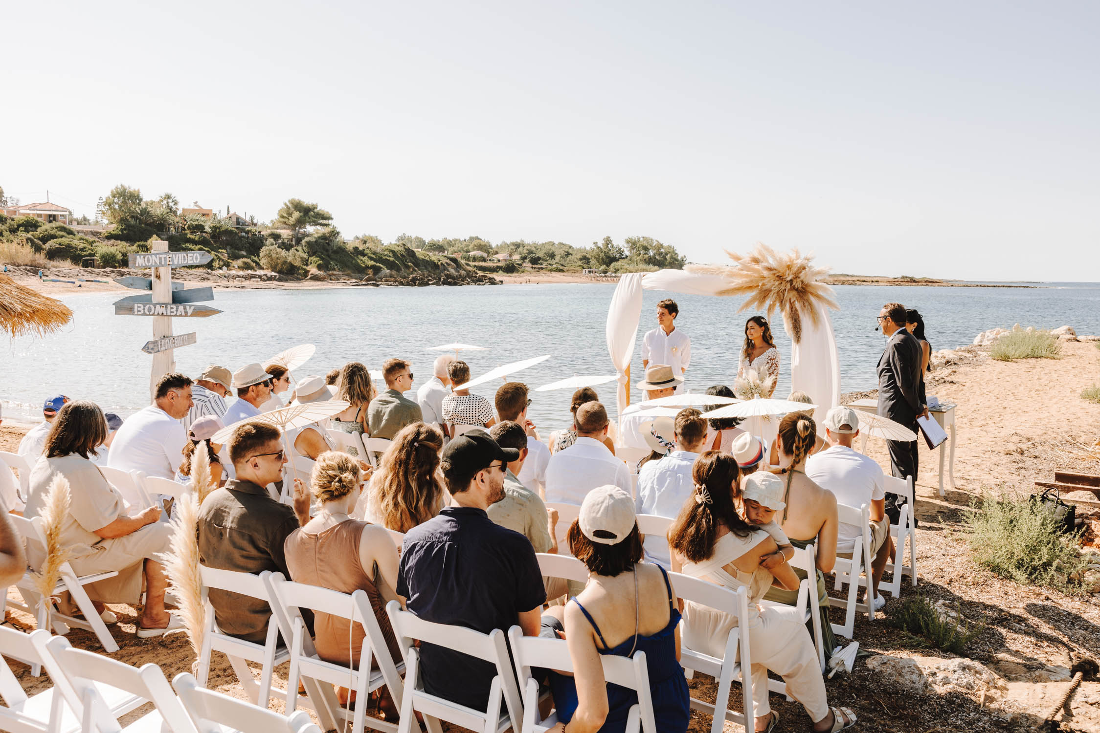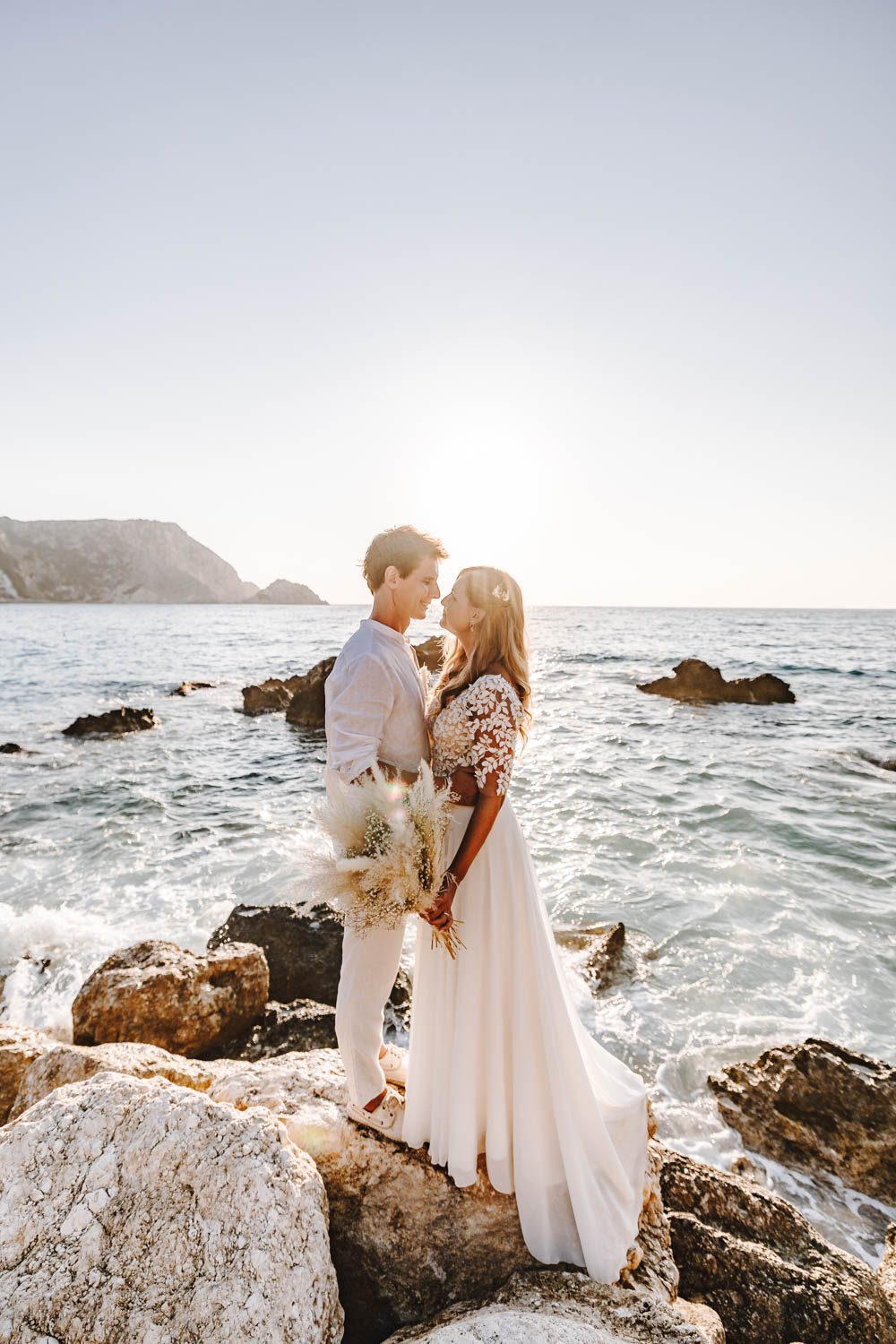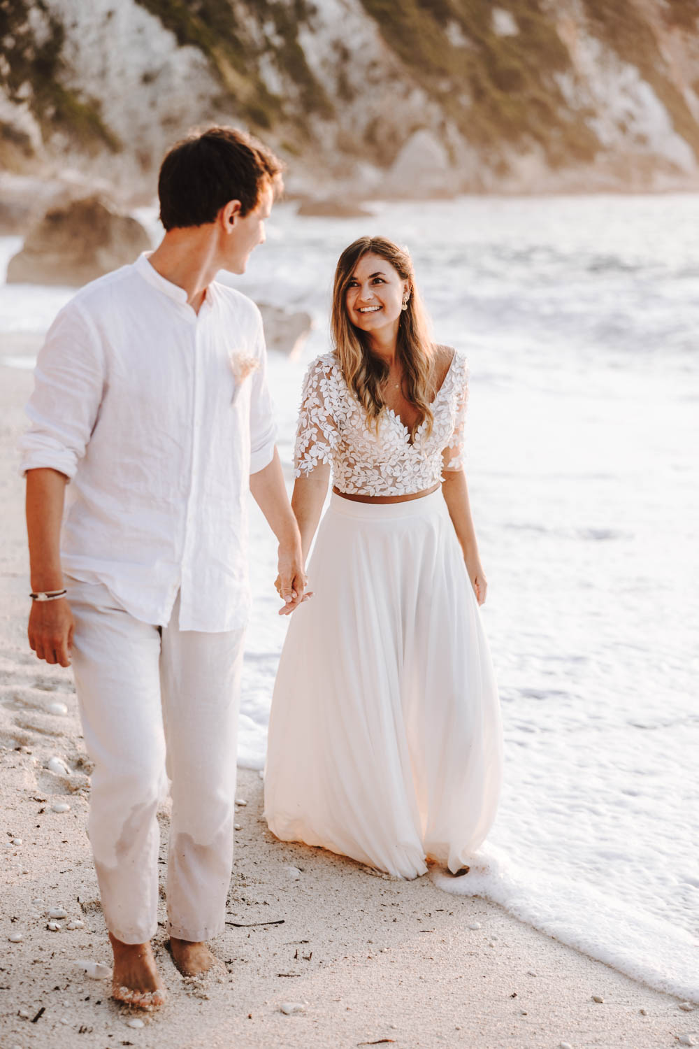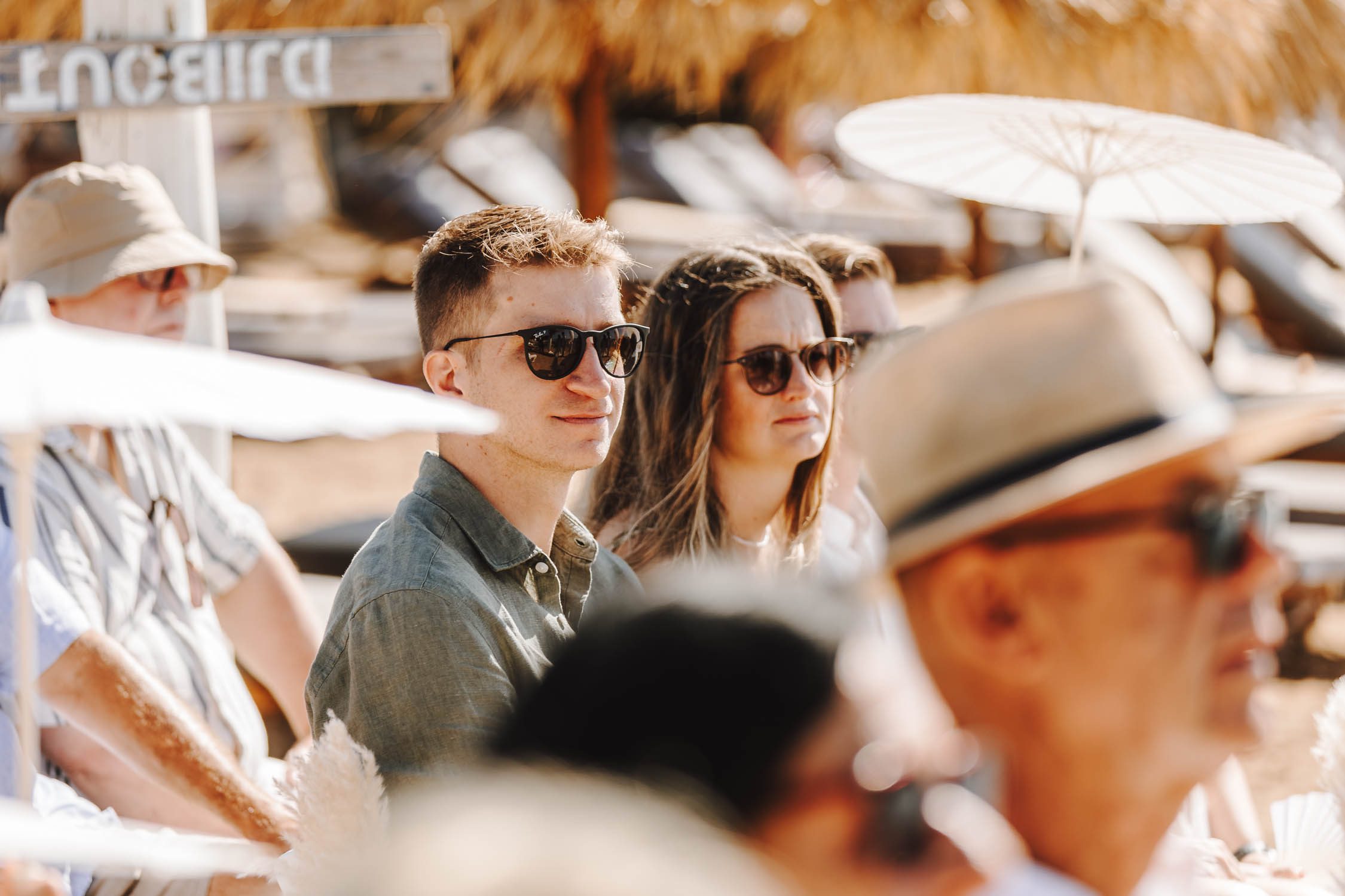 Nach dem innigen First Look habe ich am Sandstrand mit den beiden ein kleines Paarshooting gemacht, bevor es ohne große Pause zur Trauung ging. So früh am Tag war der Strand noch fast leer, und die Zeremonie blieb ganz ungestört – zwei Gäste sorgten mit Gesang und Gitarre für die ultimative Atmosphäre und man konnte die Liebe zum Detail förmlich spüren.