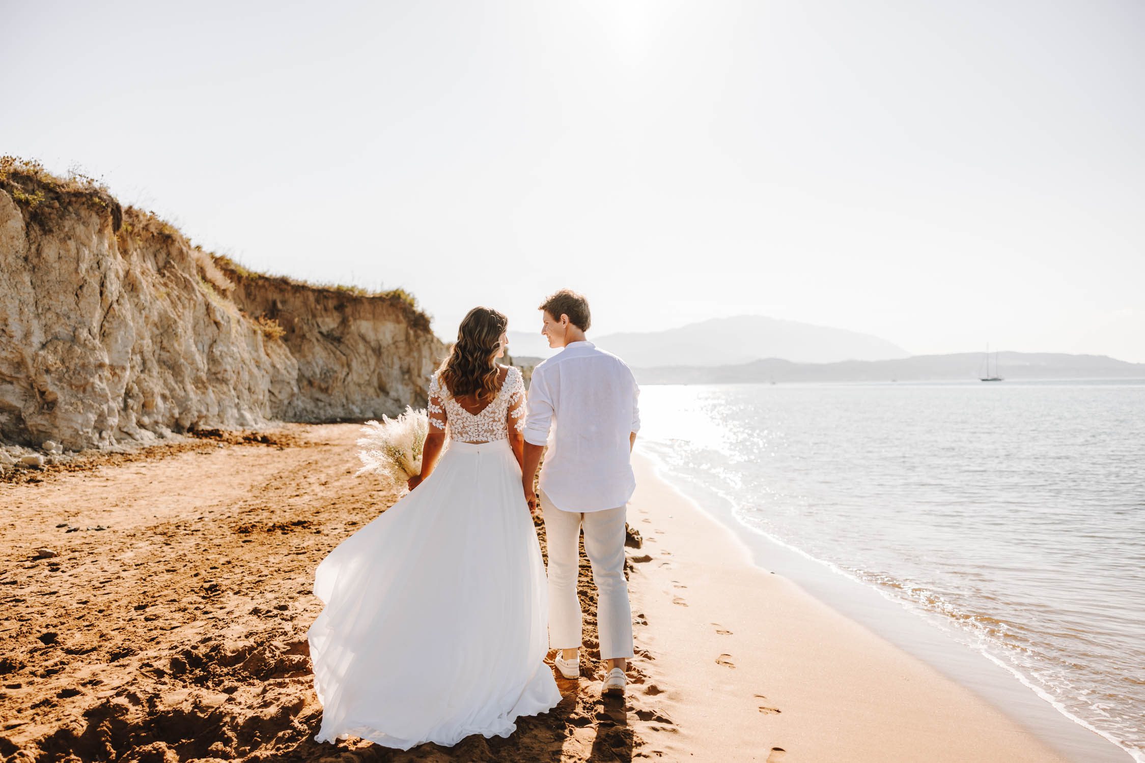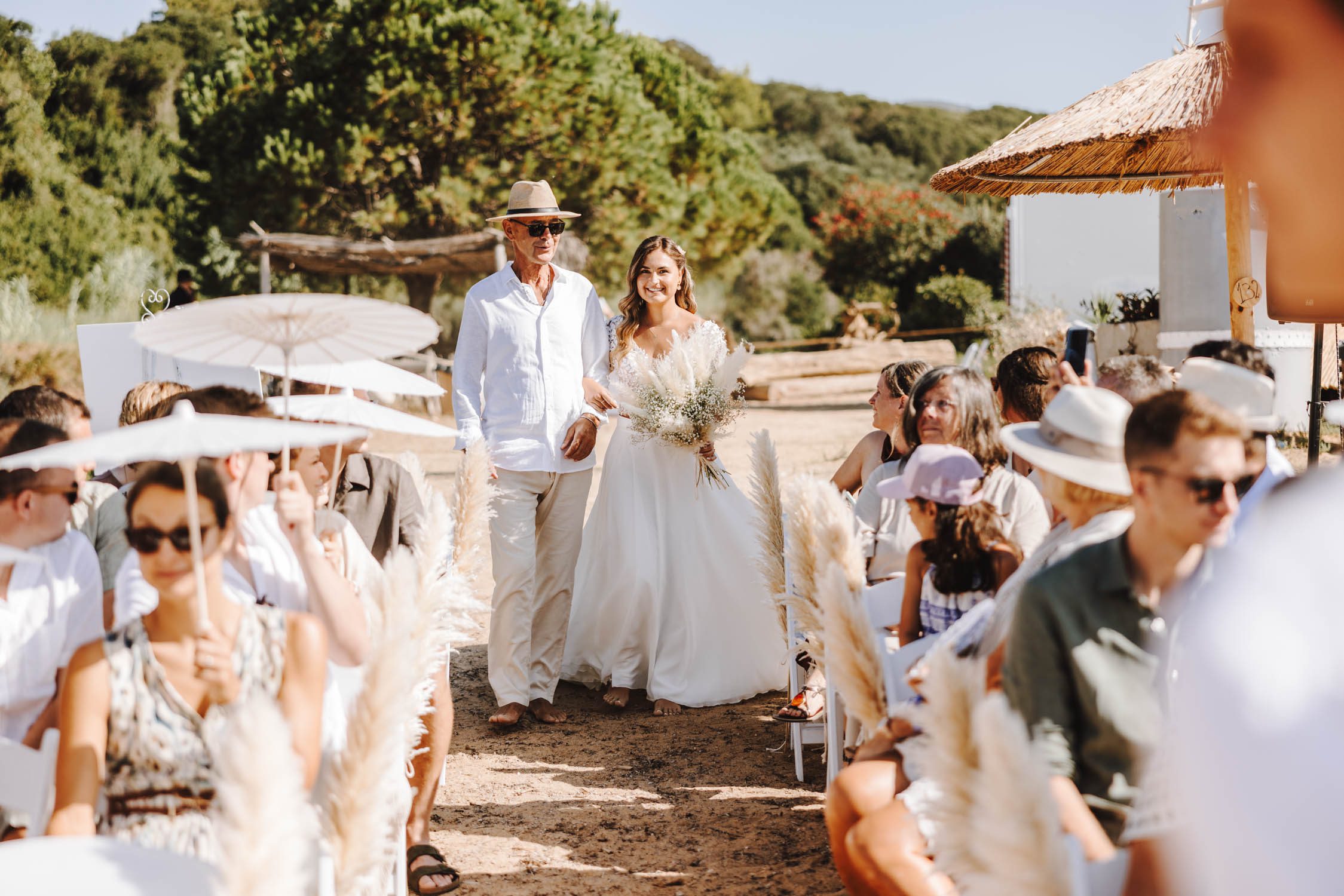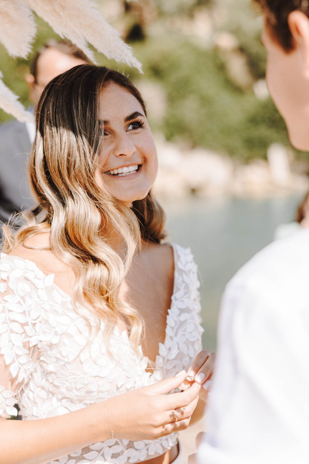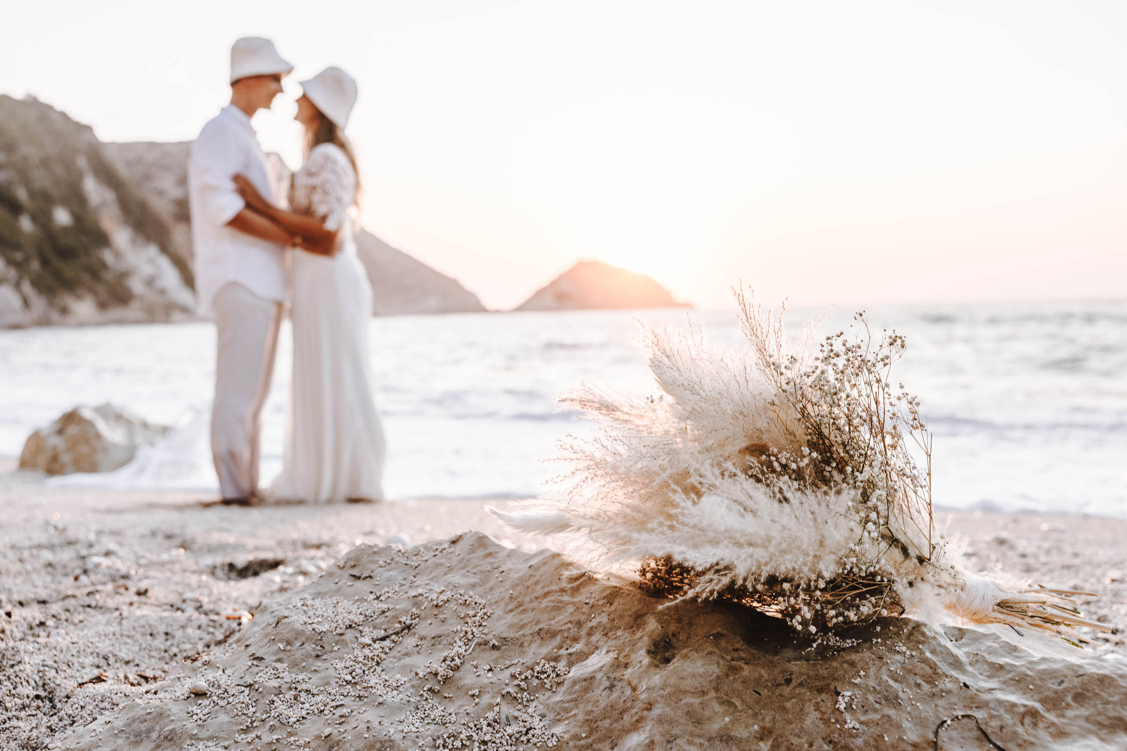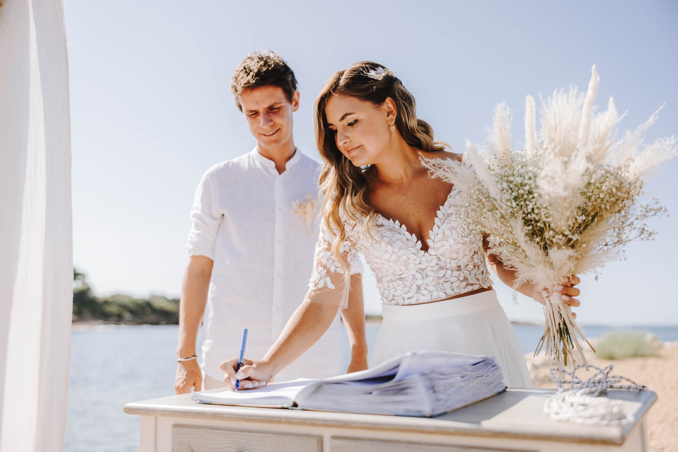 Nach dem innigen First Look habe ich am Sandstrand mit den beiden ein kleines Paarshooting gemacht, bevor es ohne große Pause zur Trauung ging. So früh am Tag war der Strand noch fast leer, und die Zeremonie blieb ganz ungestört – zwei Gäste sorgten mit Gesang und Gitarre für die ultimative Atmosphäre und man konnte die Liebe zum Detail förmlich spüren.
