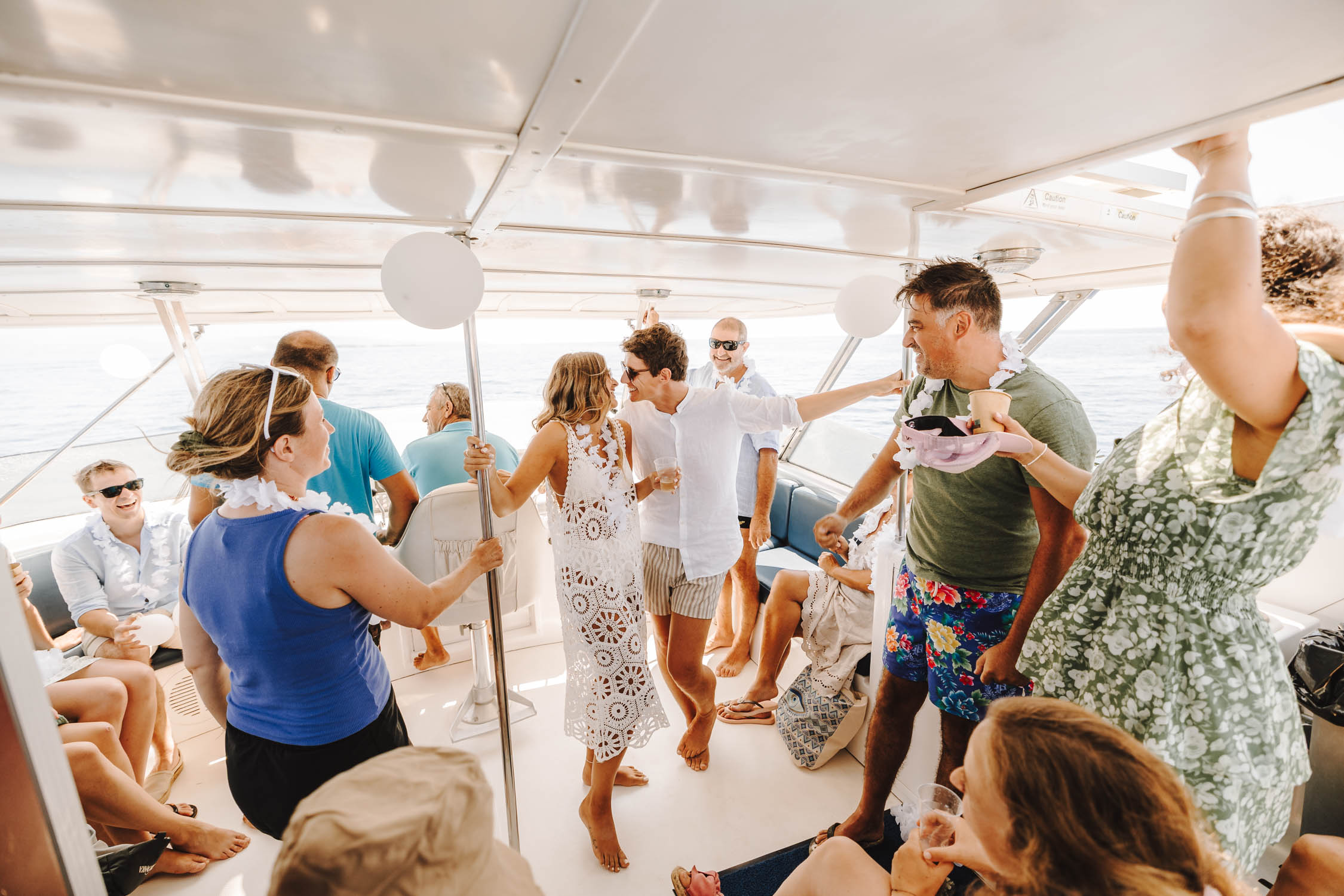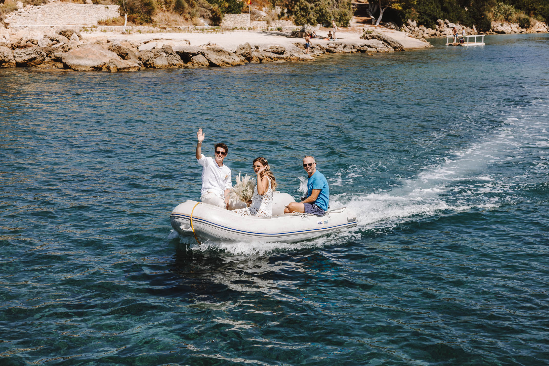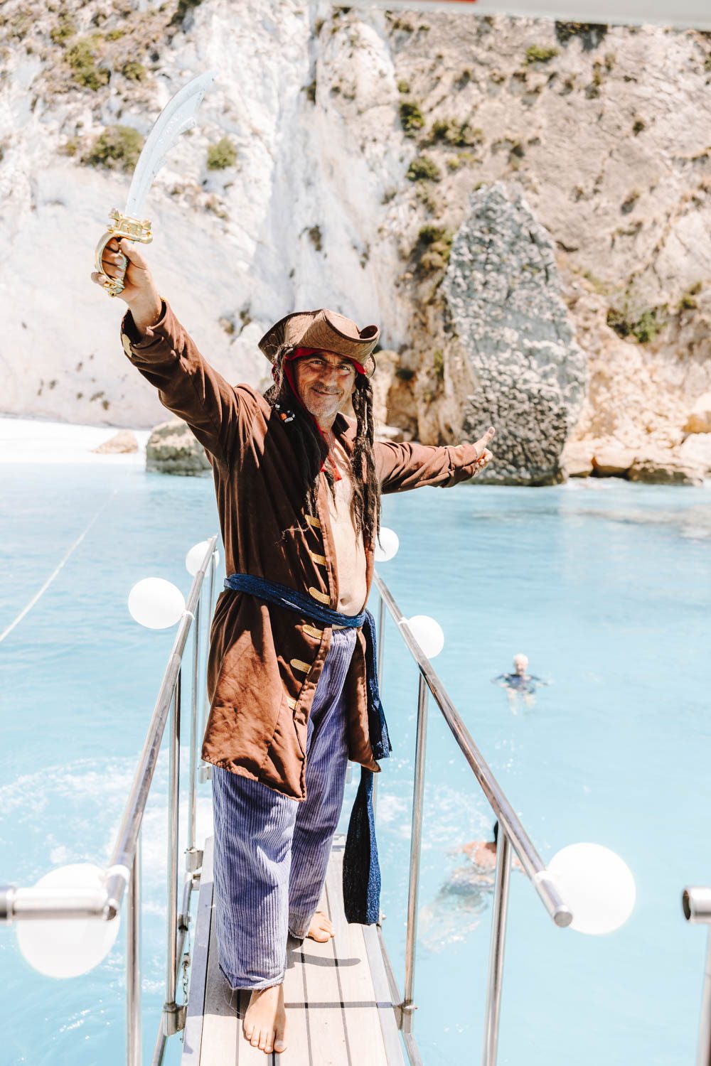 Direkt nach der Trauung sind alle mit dem Boot zu wundervollen Stränden gefahren. Und dann: Statt im feinen Zwirn zu schwitzen, sind die Gäste einfach ins Wasser gesprungen, gelacht, gebadet und die Lebensfreude gefeiert. Der Kapitän, stilecht als Pirat verkleidet, hat für den besten Vibe gesorgt! In der Bucht habe ich mit dem Brautpaar ganz besondere Bikini-Bilder im türkisblauen Wasser geschossen – ein echtes Highlight für mich als Fotograf.