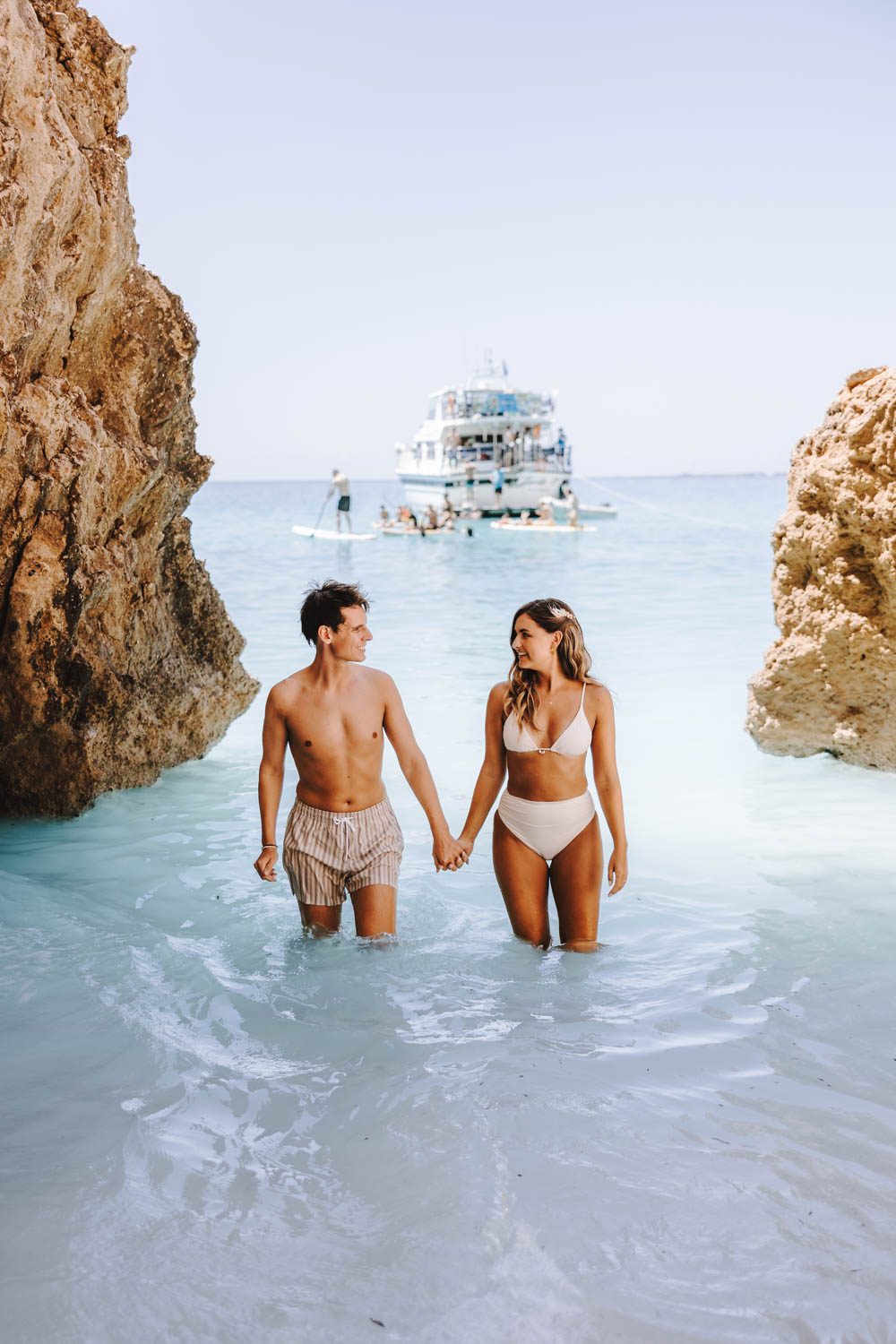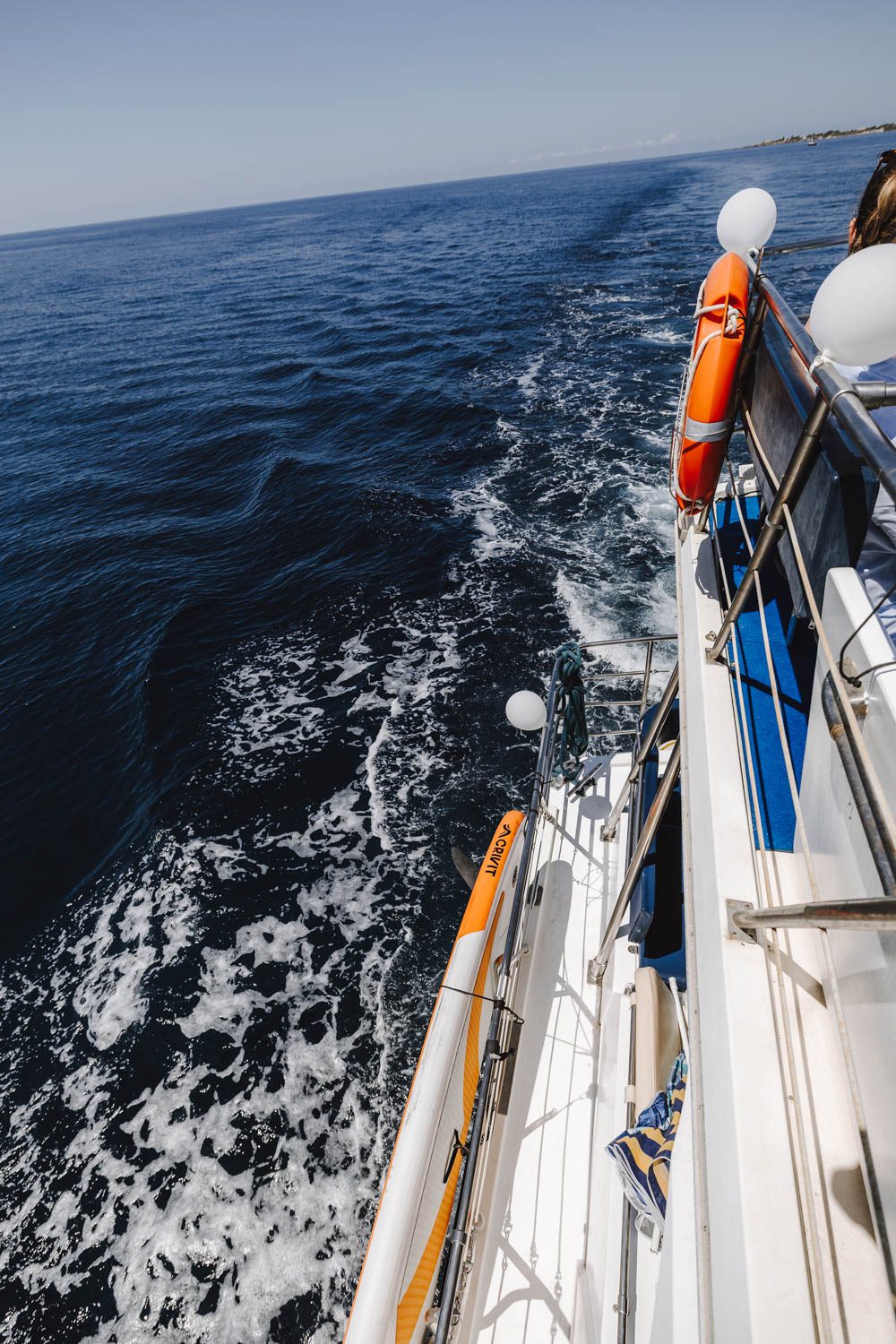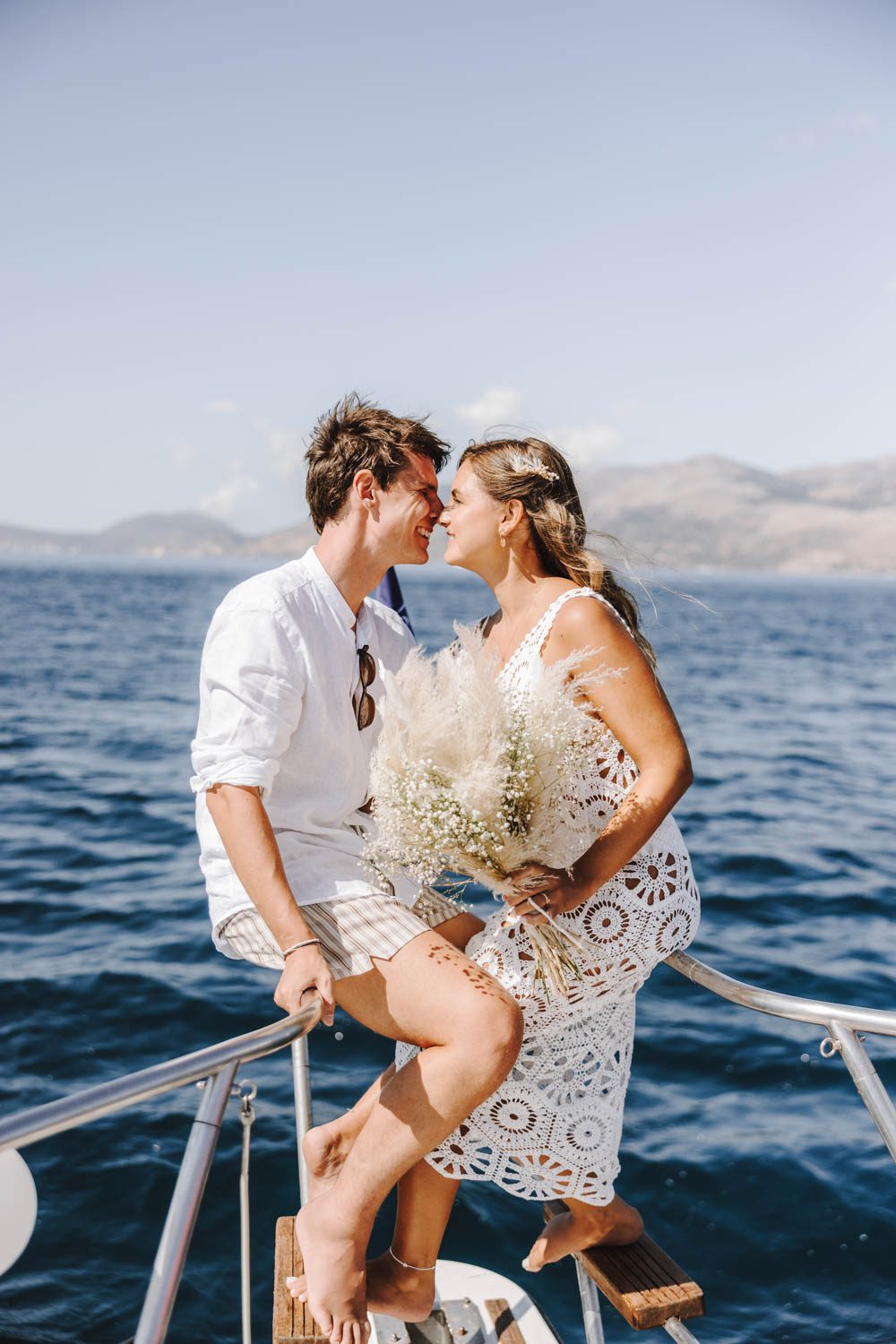 Direkt nach der Trauung sind alle mit dem Boot zu wundervollen Stränden gefahren. Und dann: Statt im feinen Zwirn zu schwitzen, sind die Gäste einfach ins Wasser gesprungen, gelacht, gebadet und die Lebensfreude gefeiert. Der Kapitän, stilecht als Pirat verkleidet, hat für den besten Vibe gesorgt! In der Bucht habe ich mit dem Brautpaar ganz besondere Bikini-Bilder im türkisblauen Wasser geschossen – ein echtes Highlight für mich als Fotograf.